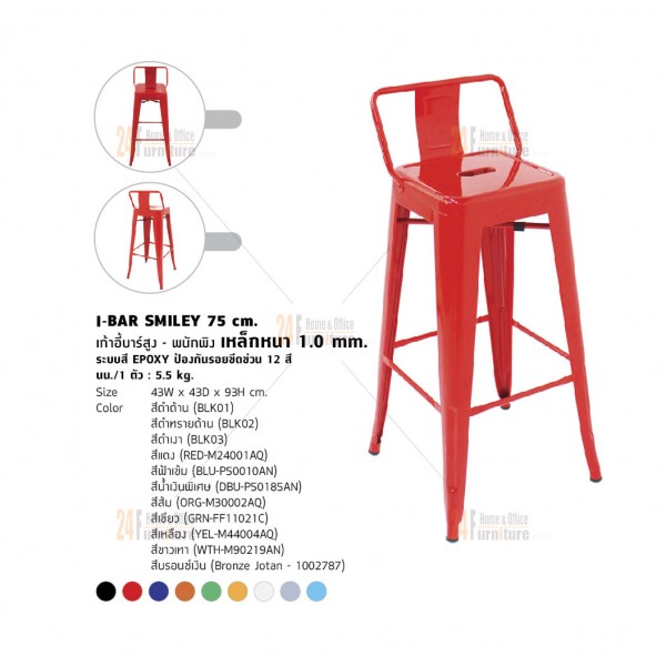 I-BAR SMILEY 75 CM : เก้าอี้บาร์สูง พนักพิง เหล็กหนา 1.0 mm.